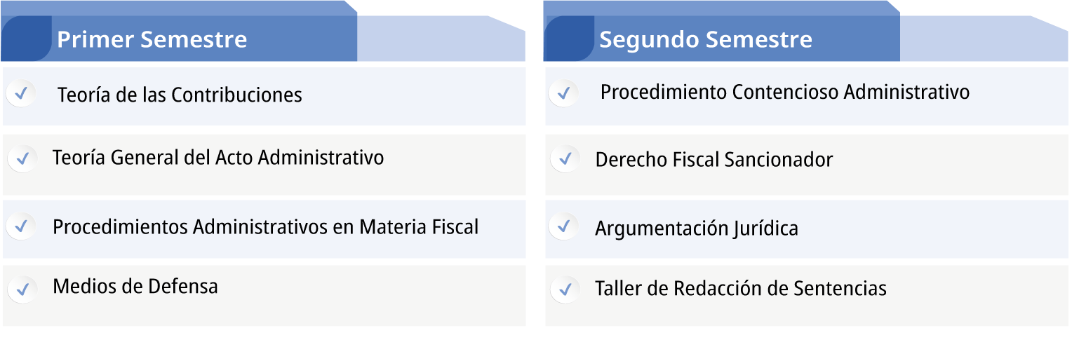 La Especialidad en Justicia Administrativa, se divide en dos semestres, en cada uno de ellos se imparten cuatro asignaturas.