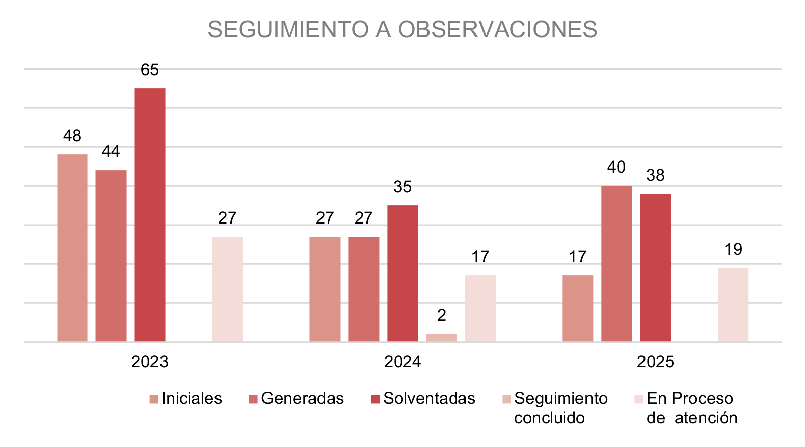 Como resultado de las auditorías de seguimiento practicadas, se corroboró la atención de las recomendaciones correctivas y preventivas comprometidas, lo que dio como resultado la solventación de 38 de las 55 observaciones que se tuvieron en seguimiento durante el periodo. Al 31 de octubre de 2025, se tienen 19 observaciones en seguimiento de las cuales 17 reportan avance parcial (vigentes vencidas) y 2 se encuentran dentro del plazo de 45 días establecido para su atención.