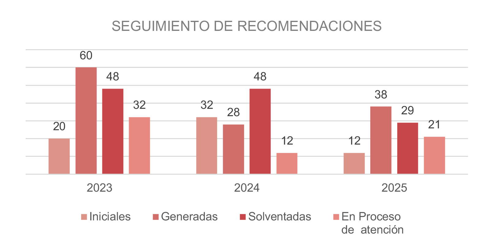 Como resultado de las 4 auditorías de seguimiento practicadas del 1 de noviembre de 2024 al 31 de octubre de 2025, se atendieron 29 recomendaciones, 15 recomendaciones se registran con avance parcial, y 6 se encuentran dentro del plazo de 45 días establecidos para su atención, para un total de 21 recomendaciones en proceso.