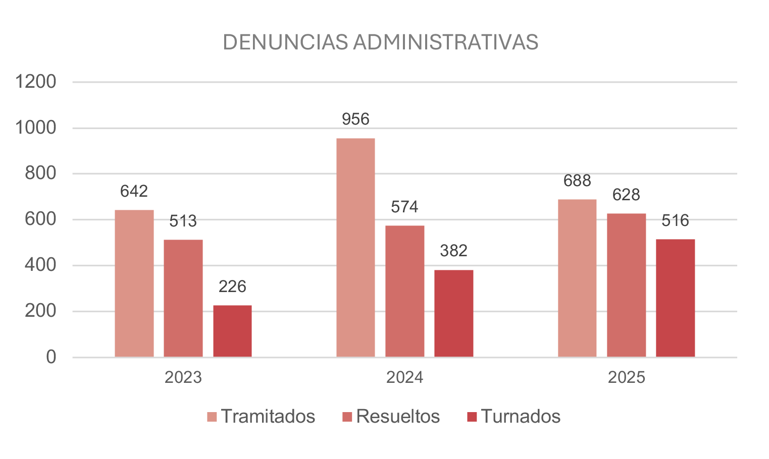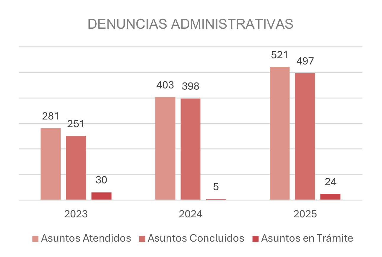 Durante el periodo del 1 de noviembre de 2024 al 31 de octubre de 2025, se recibieron 306 denuncias; estas se sumaron a las 382 registradas para un total de 688 expedientes, de los cuales fueron resueltos 628, lo que representa un 91% de avance.