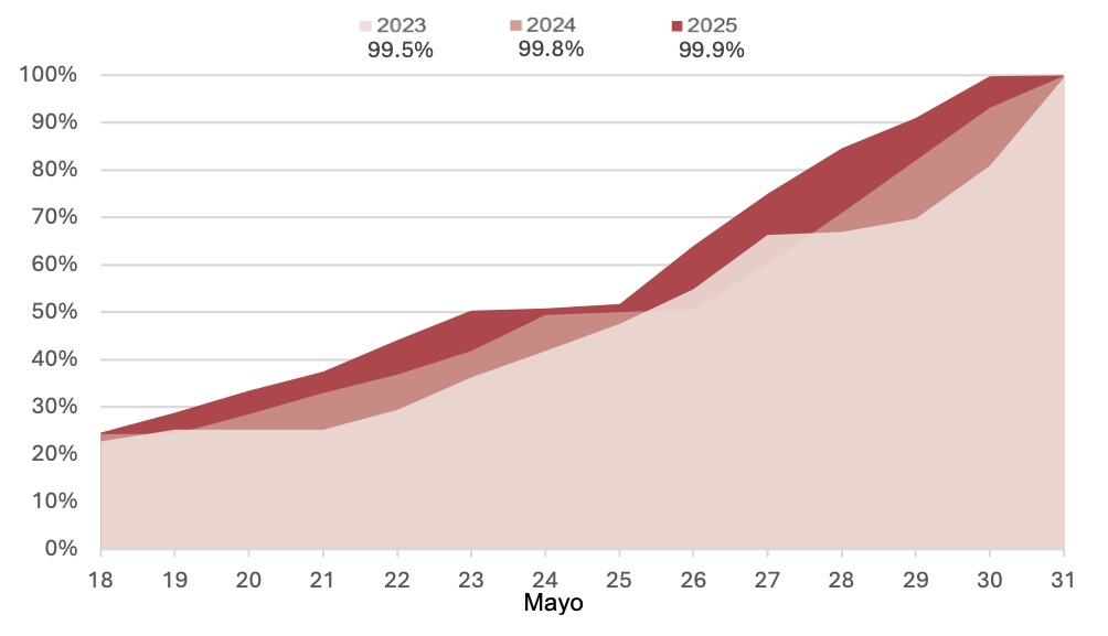 Asimismo, se presenta el comparativo del porcentaje de cumplimiento durante los últimos días para la presentación de la declaración de situación patrimonial y de intereses de modificación, de 2023 a 2025:
